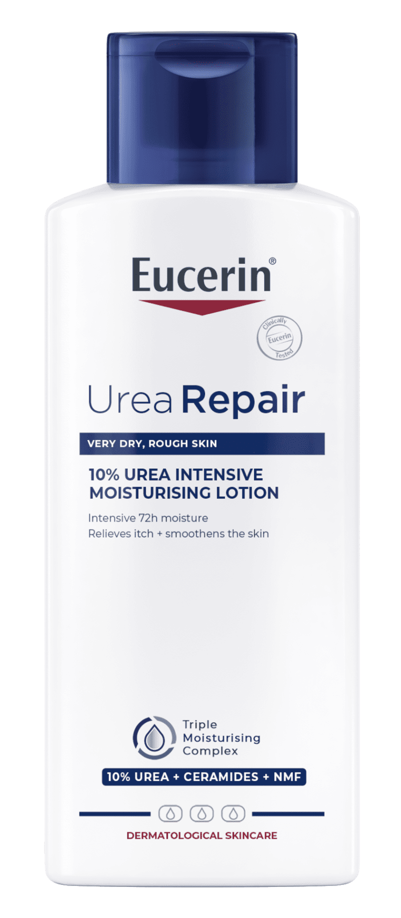 Eucerin UreaRepair PLUS 10% Urea Lotion gives very dry, rough body skin the daily care it needs. It contains a unique combination of ingredients – Urea, Ceramide and other Natural Moisturizing Factors (NMFs) – which bind moisture in and repair skin´s natural protective barrier to prevent further moisture loss. The formula has been clinically and dermatologically proven to deliver immediate relief and intense, long-lasting moisturization, delaying dryness and roughness for up to 48 hours. Skin is intensely moisturized and looks and feels smooth and supple again.